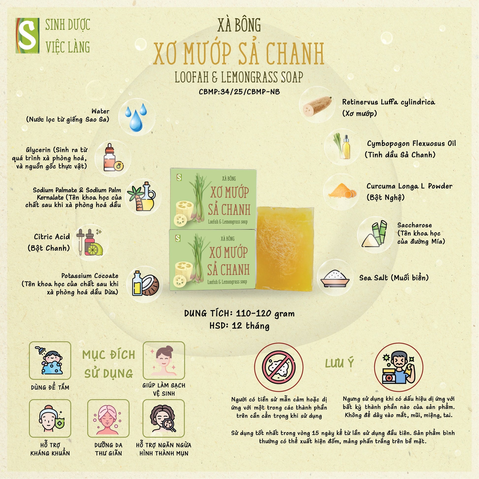 Use for hand washing, bathing, or facial cleansing like a regular soap bar. Sinh Dược herbal soaps produce a fine, soft foam that is gentle on the skin.